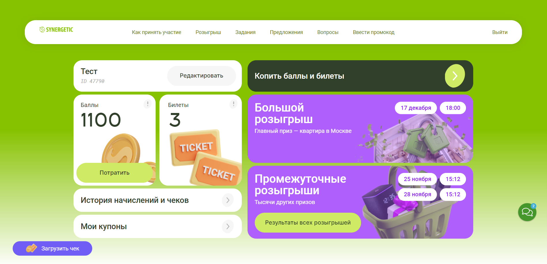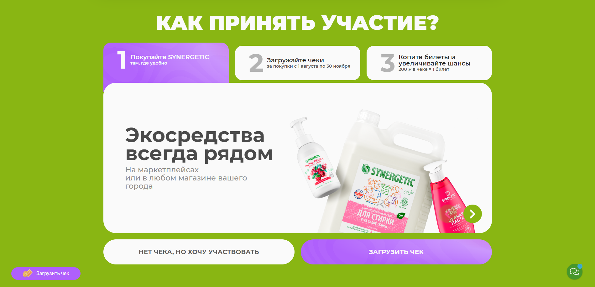 Для участия в акции пользователь должен выполнить одно действие ー загрузить чек на промо-лендинг любым удобным способом: