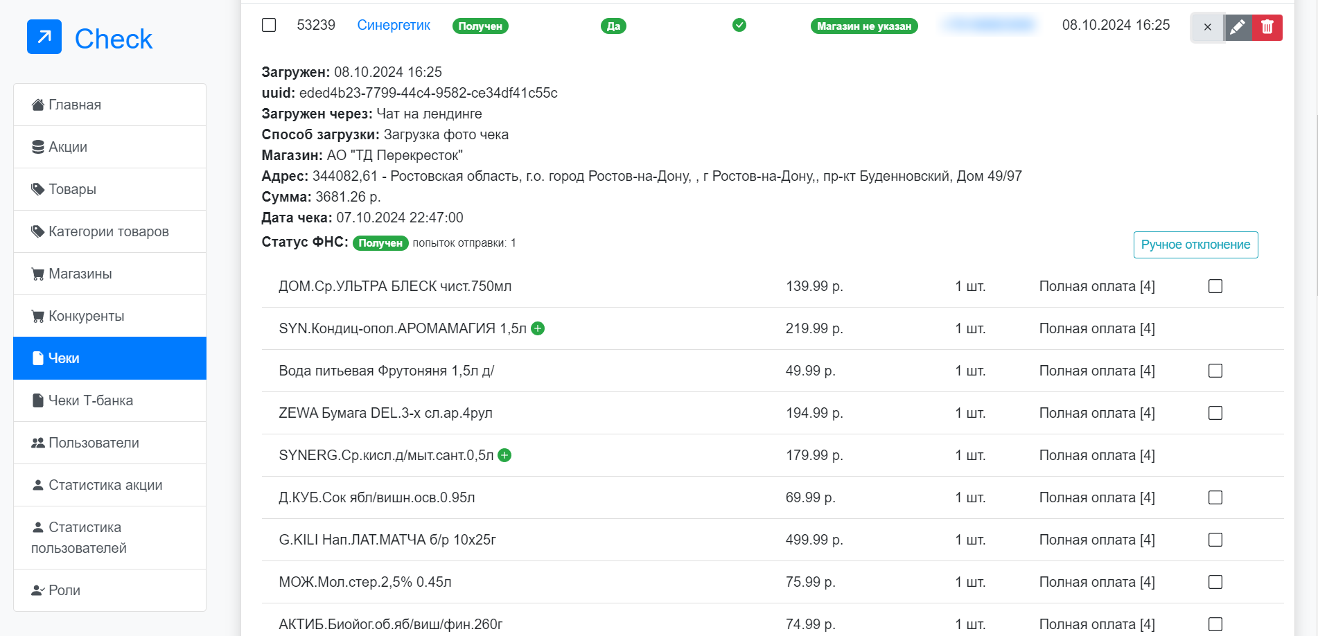 Сервис от компании Morizo анализирует чеки: проверяет по данным ФНС, определяет, какие товары и в каком количестве указаны и соответствуют ли они условиям акции. Если чек подходит по всем требованиям, то ему присваивается статус «участвует», и он отправляется на розыгрыш призов.