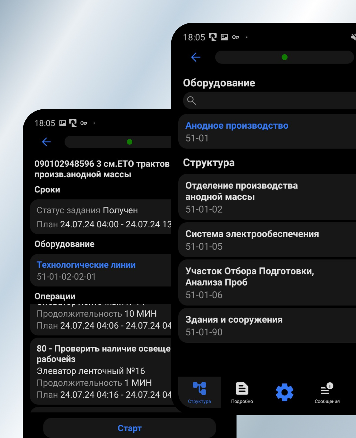 - Учёт выполнения заданий через операции СТАРТ/СТОП с фиксацией использования ТМЦ и отражением качества выполненной работы.
