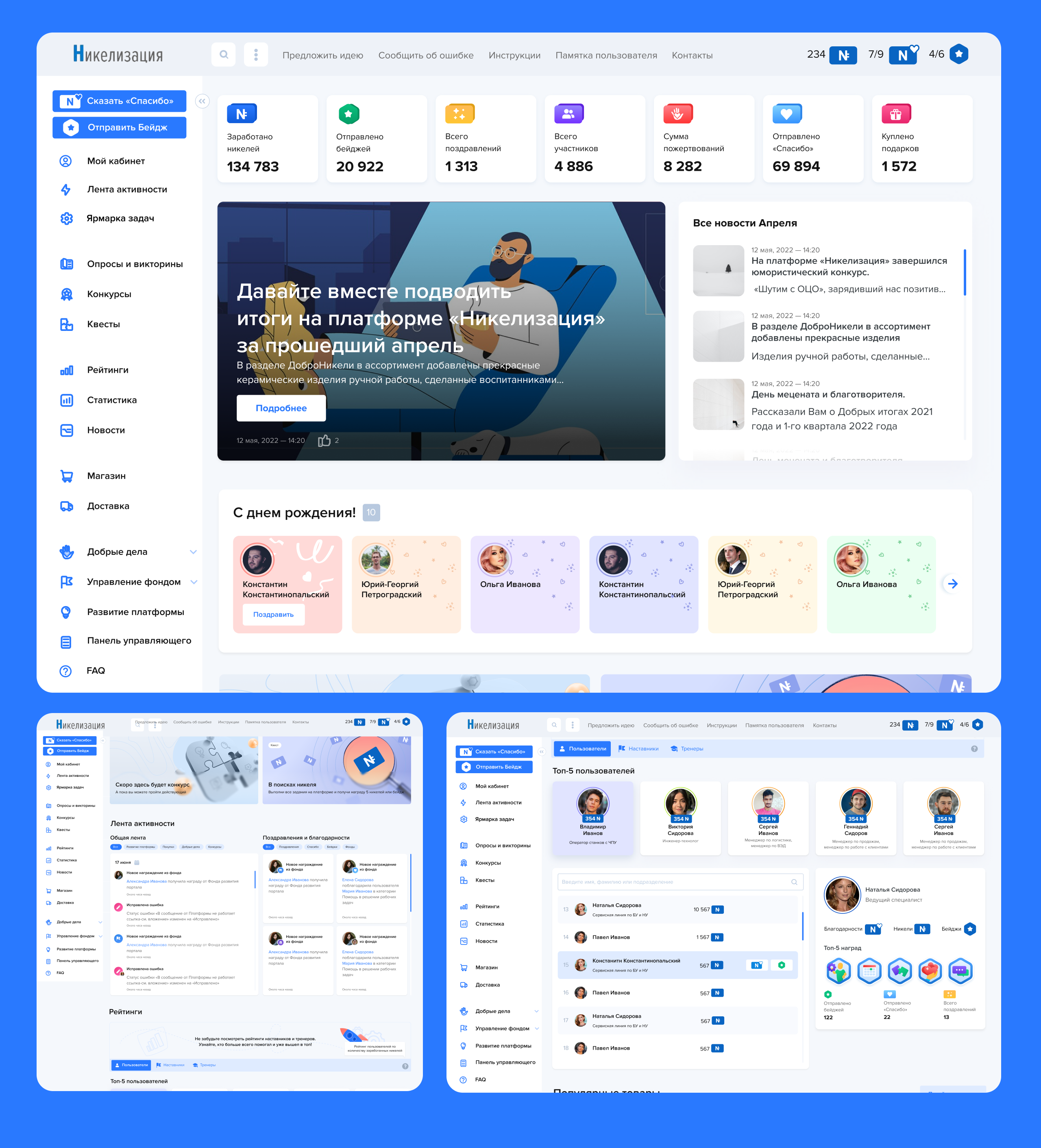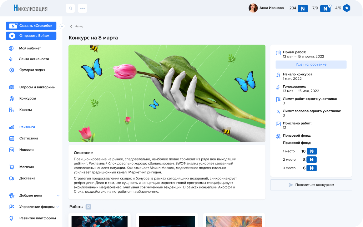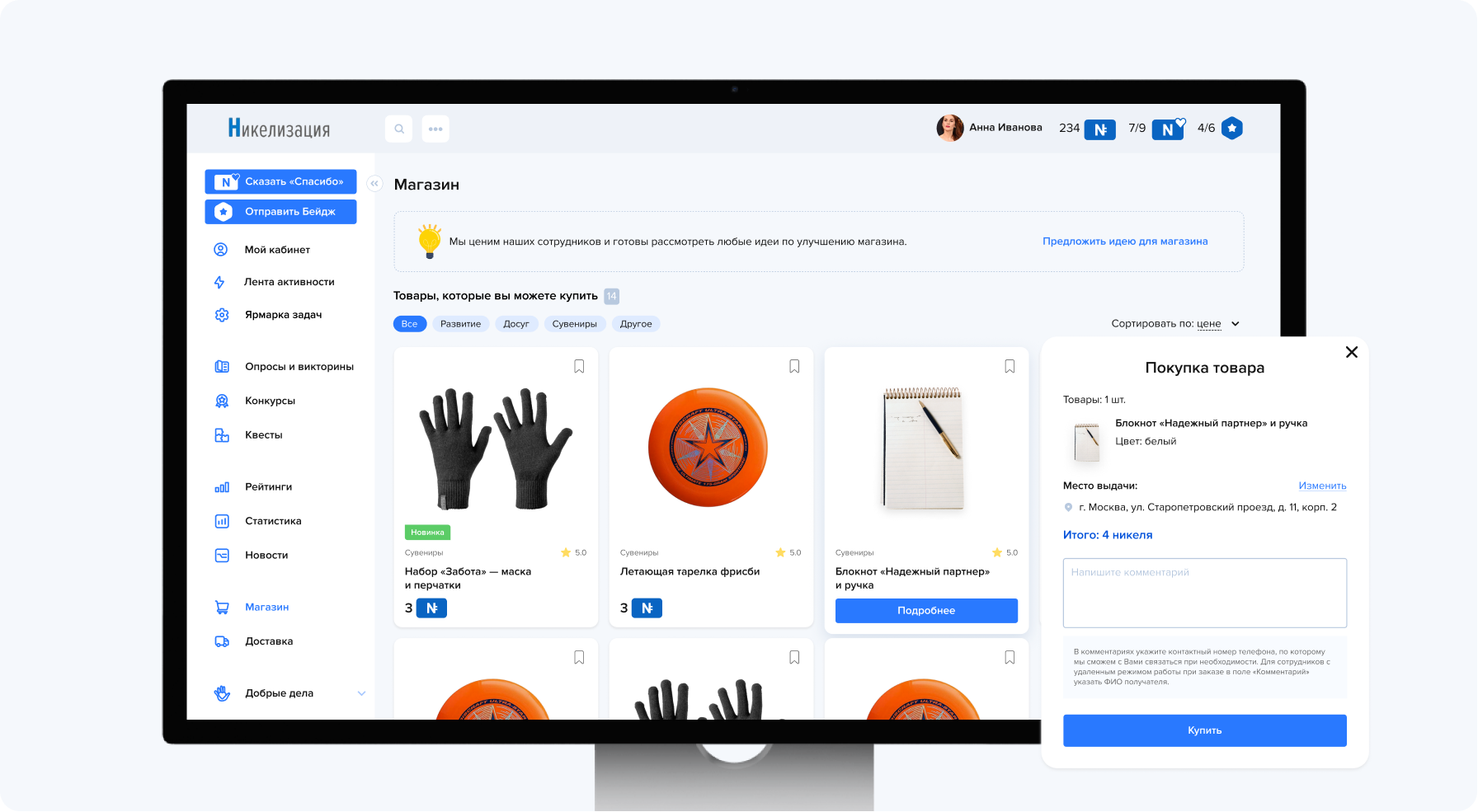 «Никелизация» по сути представляет собой целую эко-систему, включающую функциональности по различным направлениям. В рамках платформы сотрудники компании имеют возможность общаться друг с другом, видеть прогресс своих коллег и делиться собственными достижениями, принимать участие в конкурсах, викторинах и опросах и даже покупать аксессуары и сувениры с символикой компании в онлайн-магазине.