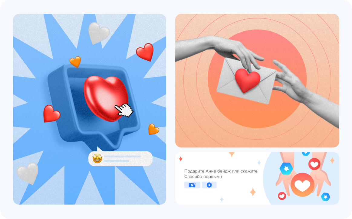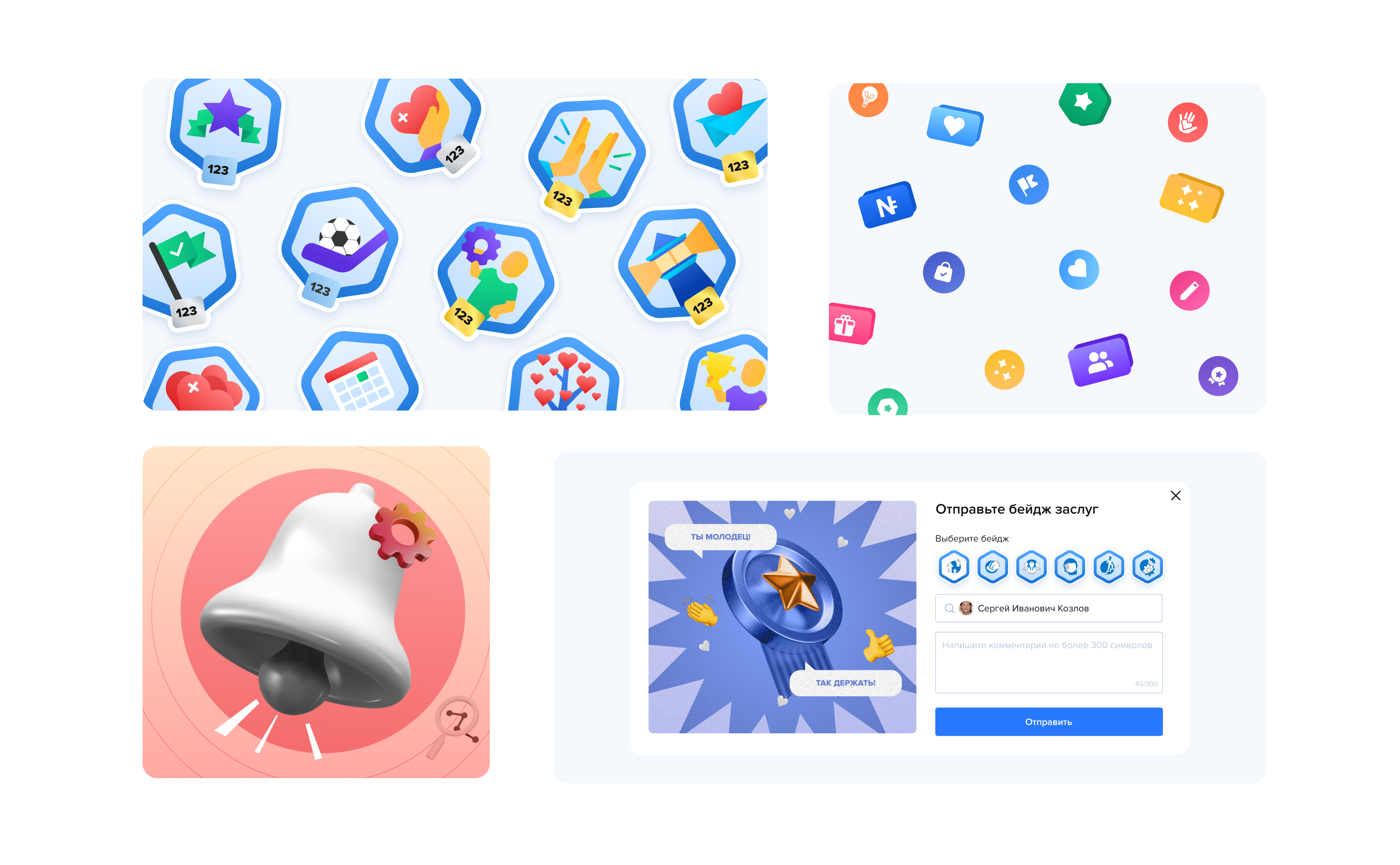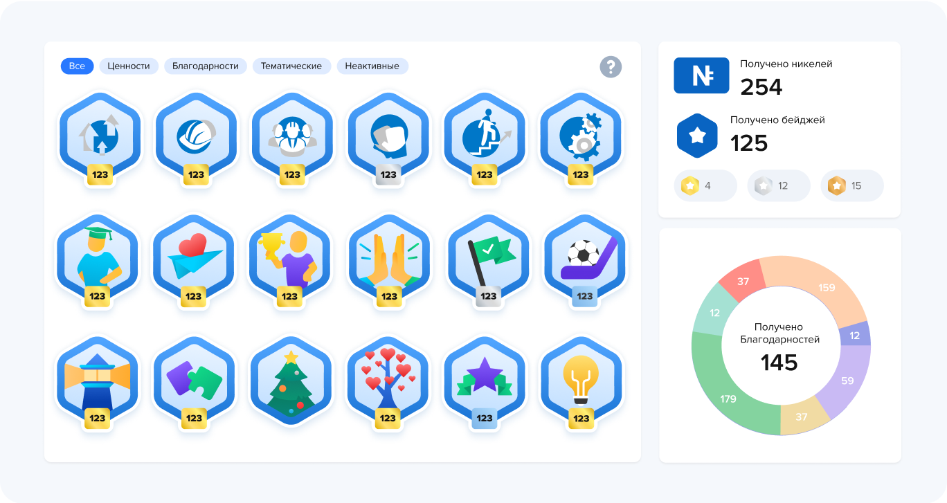Бейдж — особый элемент, который выдается на платформе как централизованно от имени компании, так и каждым сотрудником по желанию другим сотрудникам. Каждый бейдж несет в себе информацию