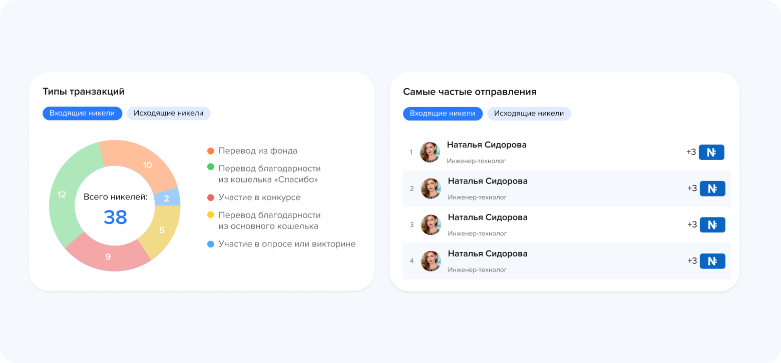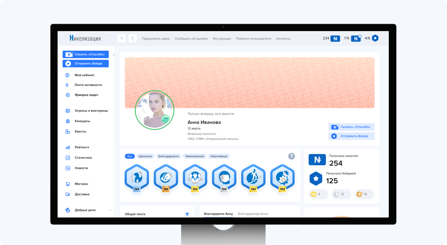 В нем содержится вся информация о сотруднике: его награды (бейджи и «спасибо» от коллег), количество «никелей» на счету, лента активности, которая включает в себя все последние действия пользователя на платформе и многое другое.