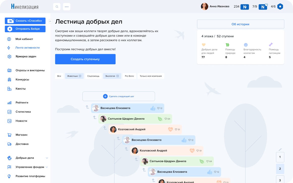 В разделе «Лестница добрых дел» сотрудники могут наблюдать за «добрыми» делами коллег и делиться своими, добавляя новую «ступеньку» (с описанием «доброго дела», к примеру, поездки в приют для животных, участия в субботнике и тд) к «лестнице добрых дел», тем самым продолжая коллективную традицию!